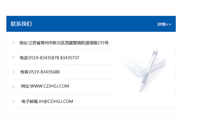 地址:常州市新北區友邦商務大廈1幢16、17層  電話:0519-85101652  傳真:0519-85112595  郵編:213022  網址:www.cz-jiayue_cn.jyaxjz.com  郵箱:xiajifengaa@163.com